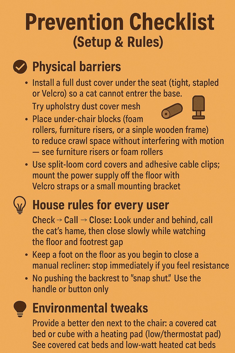 - Check → Call → Close: Look under and behind, call the cat’s name, then close slowly while watching the floor and footrest gap.