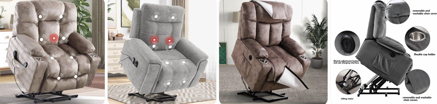 ~500 lb (verify) | Wide | Extended | Power lift & recline | Fabric/Faux leather | Check listing | Brand/retailer policy |
