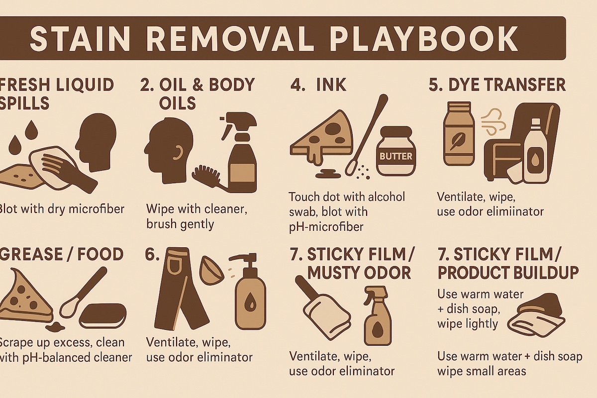 - Faux leather/PU/vinyl: Use plastic/vinyl cleaners; skip waxy conditioners formulated for natural leather.