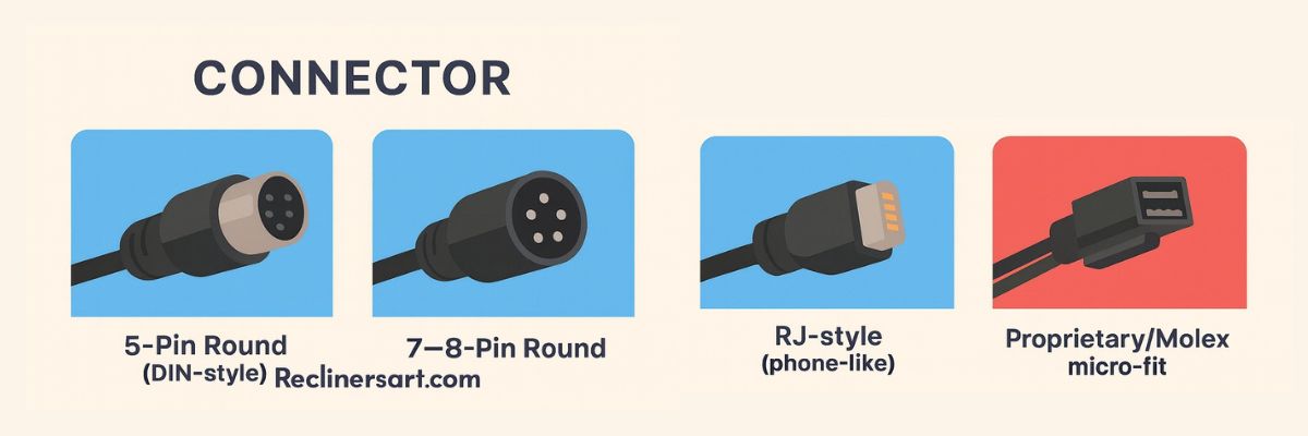 7–8-Pin Round | Round plug, more pins | Multi-function (headrest, lumbar, heat/massage) | 7/8-pin remotes |